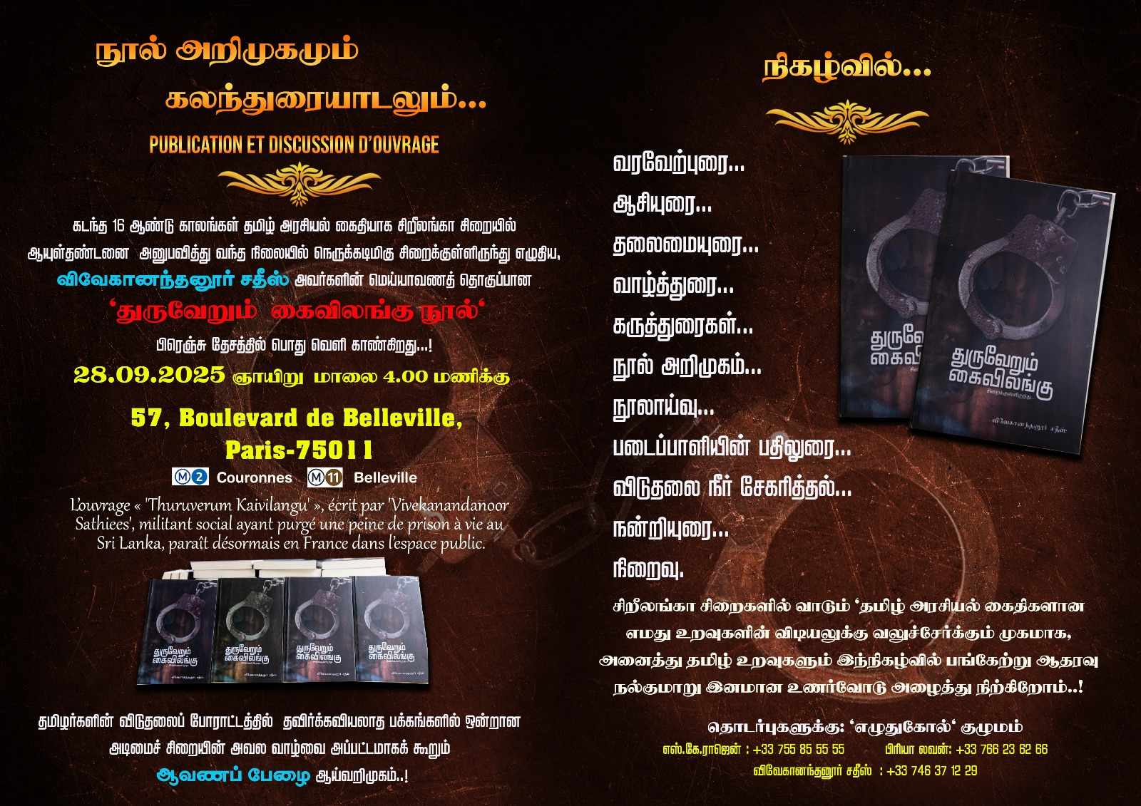 16 ஆண்டுகள் 'தமிழ் அரசியல் கைதி'யாக ஸ்ரீலங்கா சிறையில் ஆயுள் தண்டனை அனுபவித்து வந்த 'விவேகானந்தனூர் சதீஸ்' அவர்கள், நெருக்கடிமிகு சிறைக்குள்ளிருந்துஎழுதிய உண்மையாவணத்  தொகுப்பான 'துருவேறும் கைவிலங்கு' நூல், பிரெஞ்சு தேசத்தில் பொதுவெளி காண்கிறது..!