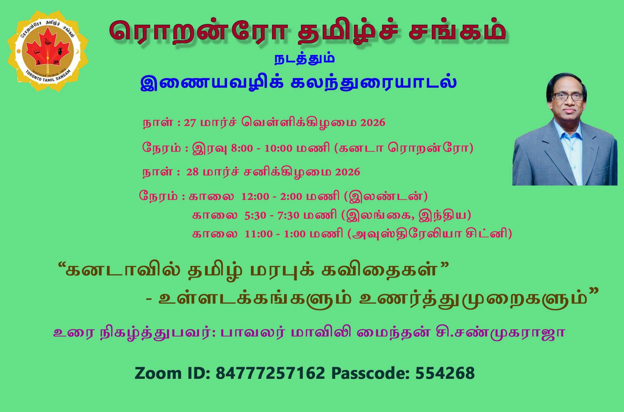 ரொறன்ரோ தமிழ்ச் சங்கம் நடத்தும் இணையவழிக் கலந்துரையாடல்: “கனடாவில் தமிழ் மரபுக் கவிதைகள் - உள்ளடக்கங்களும் உணர்த்துமுறைகளும்”