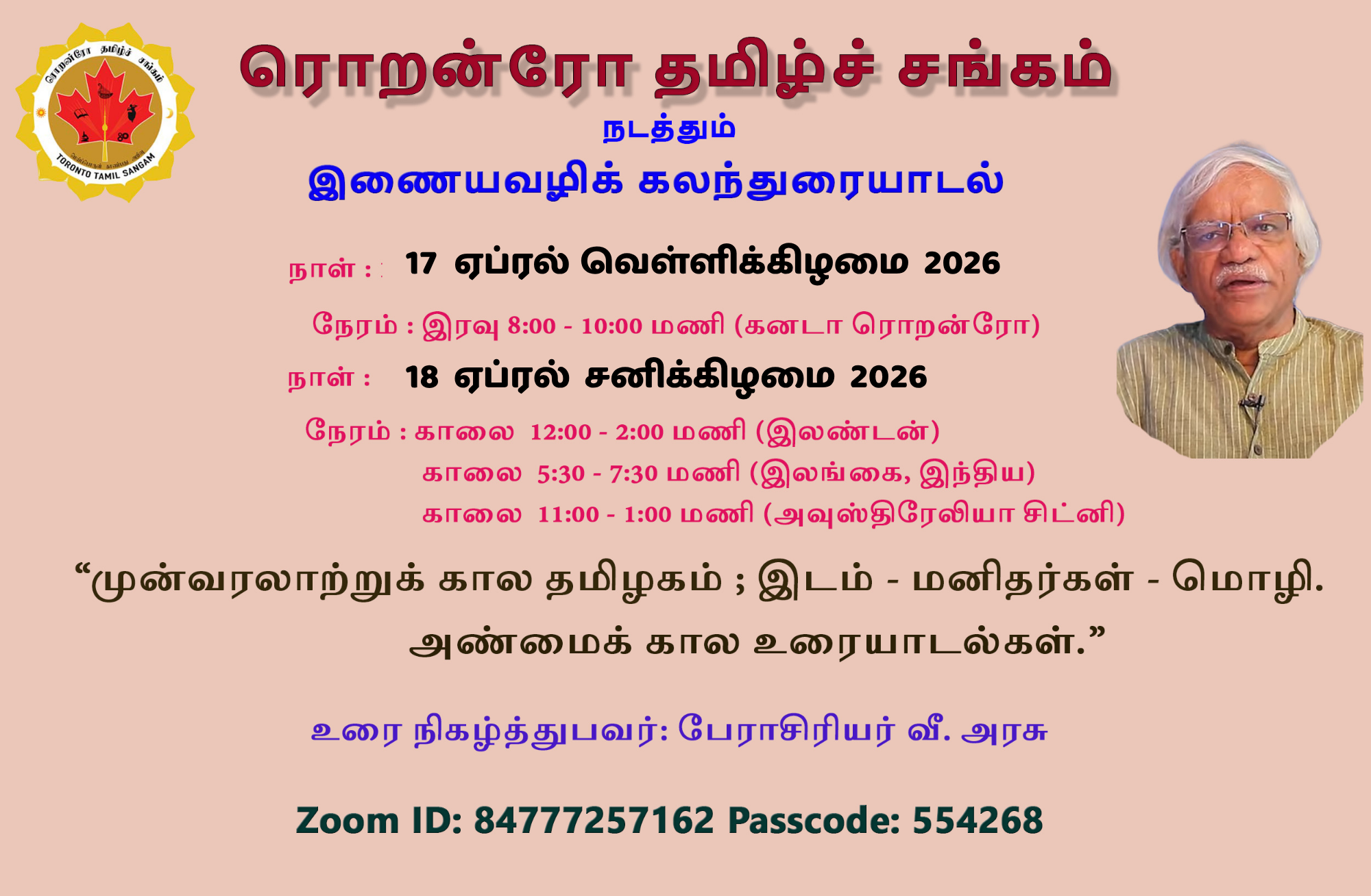 உரை நிகழ்த்துபவர் :  பேராசிரியர் வீ. அரசு
