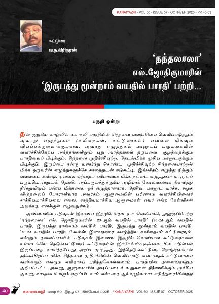 - எழுத்தாளர் 'நந்தலாலா' ஜோதிகுமாரின் '23ஆம் வயதில் பாரதி' நூல் பற்றிய , கணையாழி சஞ்சிகையின் அக்டோபர் 2025 இதழில் வெளியான எனது கட்டுரை.-