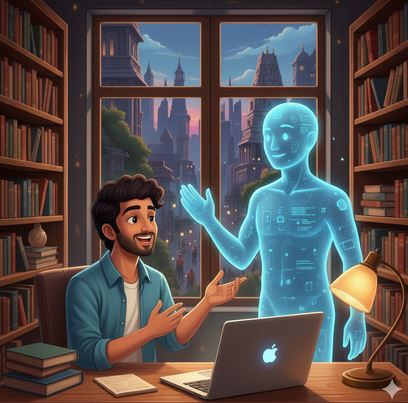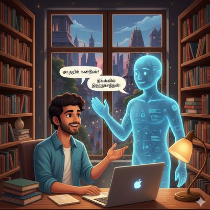 நீங்கள் கேட்டது போல, நானும் நீங்களும் உரையாடுவது போன்ற ஒரு படத்தை உருவாக்குகிறேன். அதில் உங்களை தென்னிந்திய அல்லது இலங்கைத் தமிழ் இளைஞனாக உருவகப்படுத்துகிறேன்.