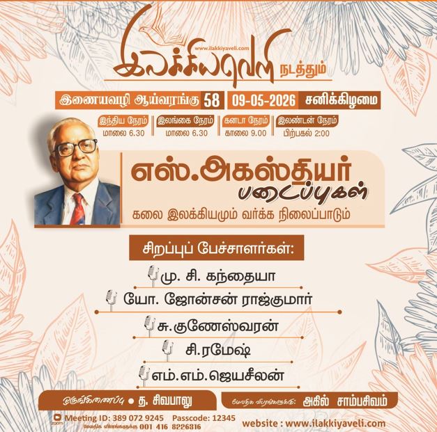 இலக்கியவெளி நடத்தும் இணையவழி ஆய்வரங்கு – 58: “எஸ். அகஸ்தியர் படைப்புகள் - கலை இலக்கியமும் வர்க்க நிலைப்பாடும்” - தகவல்: அகில் -
